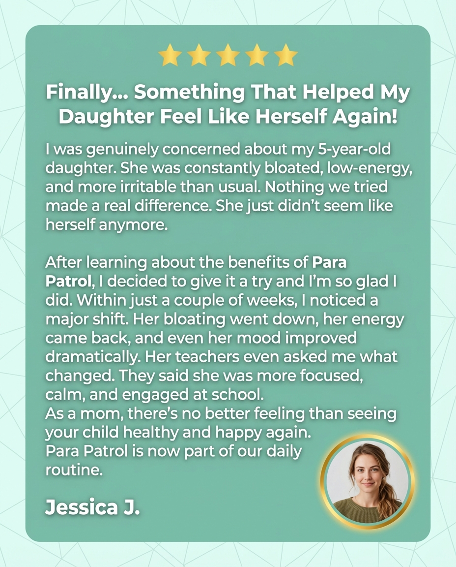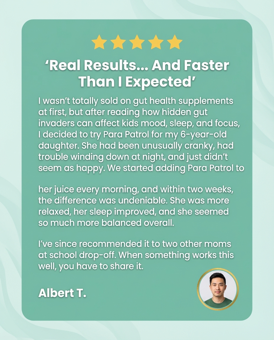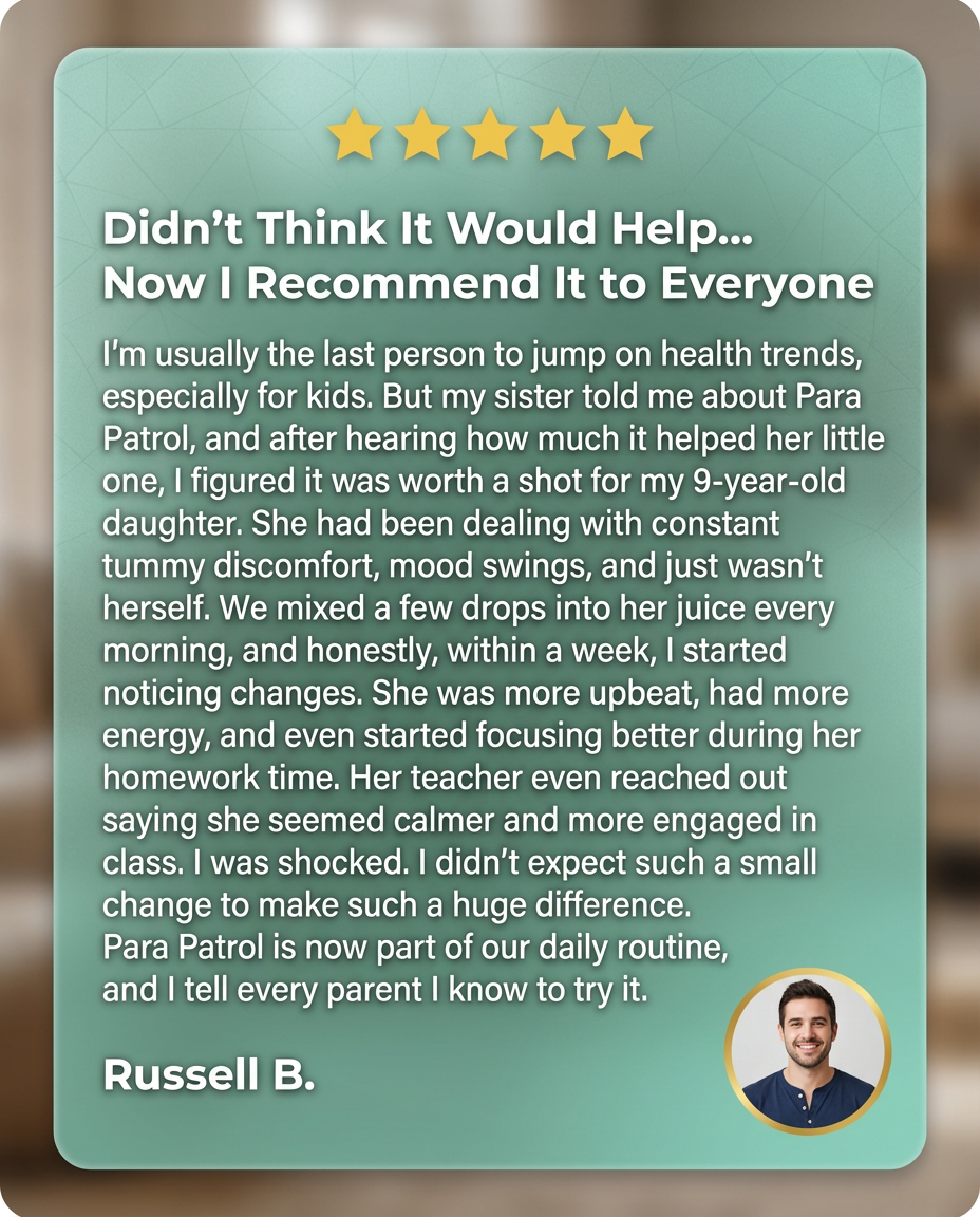 I was skeptical about another supplement helping but I'm so glad I tried Para Patrol. My 6-year-old had been dealing with constant tummy aches, mood swings, and couldn't sleep through the night. Within two weeks of adding these drops to her morning juice, she's calmer, happier, and finally sleeping soundly.