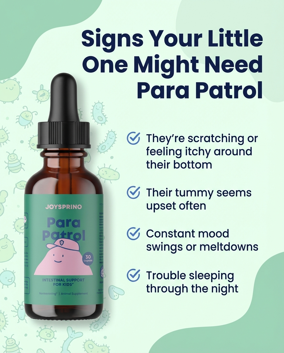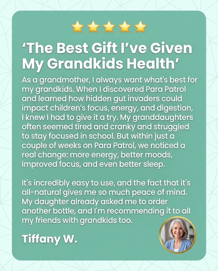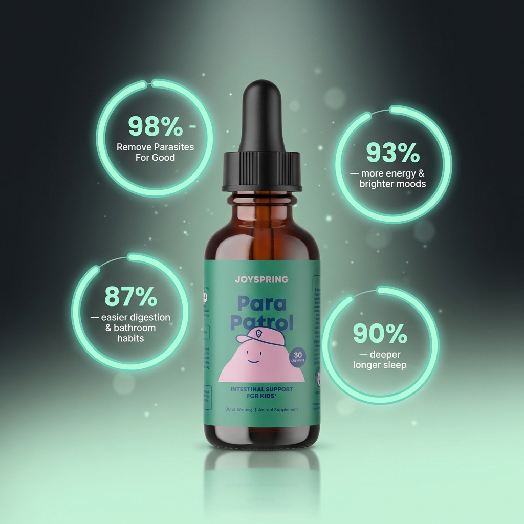 I was skeptical about another supplement helping but I'm so glad I tried Para Patrol. My 6-year-old had been dealing with constant tummy aches, mood swings, and couldn't sleep through the night. Within two weeks of adding these drops to her morning juice, she's calmer, happier, and finally sleeping soundly.