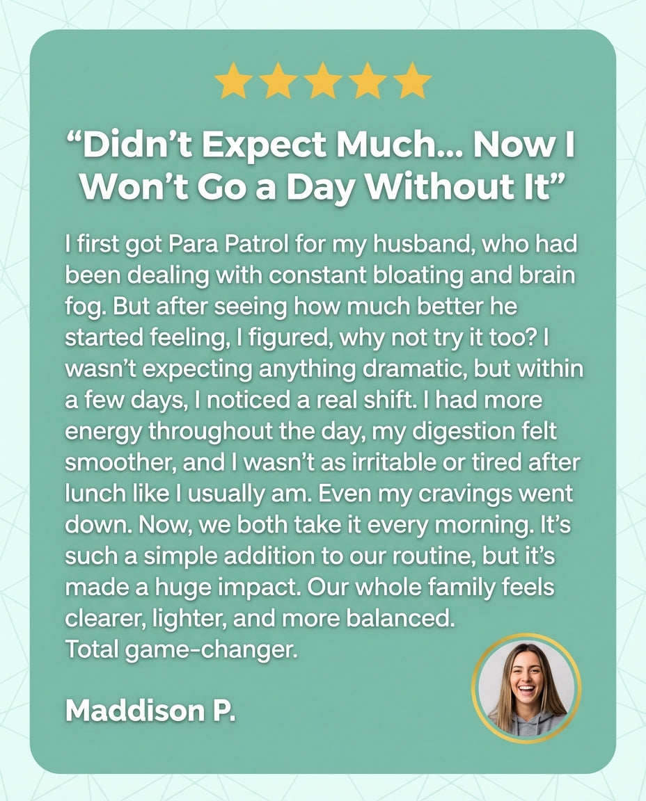 Being a mom of three means I'm always watching for signs something's off. My youngest had been irritable, scratching constantly, and refusing to eat. Para Patrol was so easy to add to her smoothie ,she didn't even notice. Within a week, the scratching stopped, her appetite came back, and her teachers said she was more focused in class. My colleagues keep asking what changed!