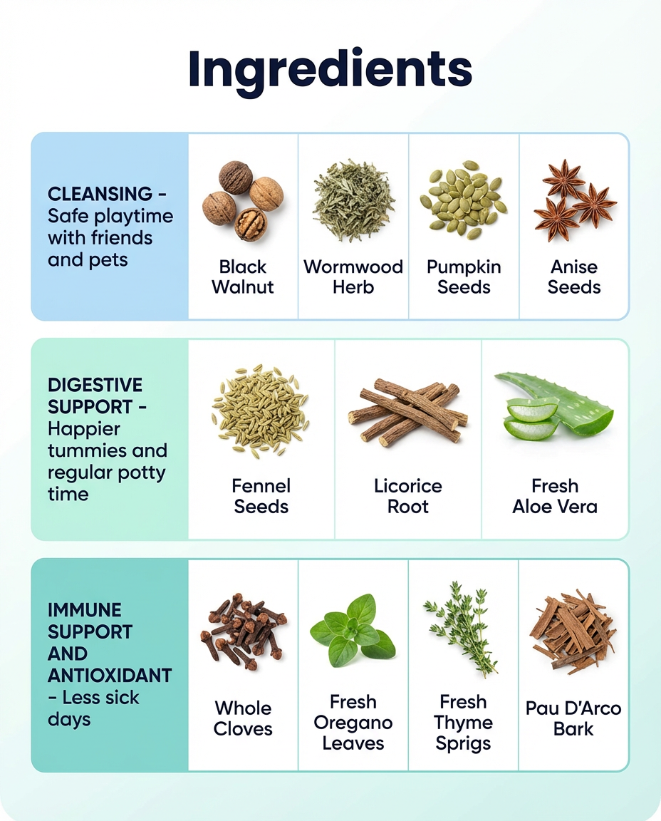 Oregano, Clove, Thyme, and Pau D'arco activate your child's natural immune defenses, creating a protective shield that prevents re-infestation. This long-term protection keeps your child's gut clean, their immune system strong, and their energy and mood consistently elevated.
