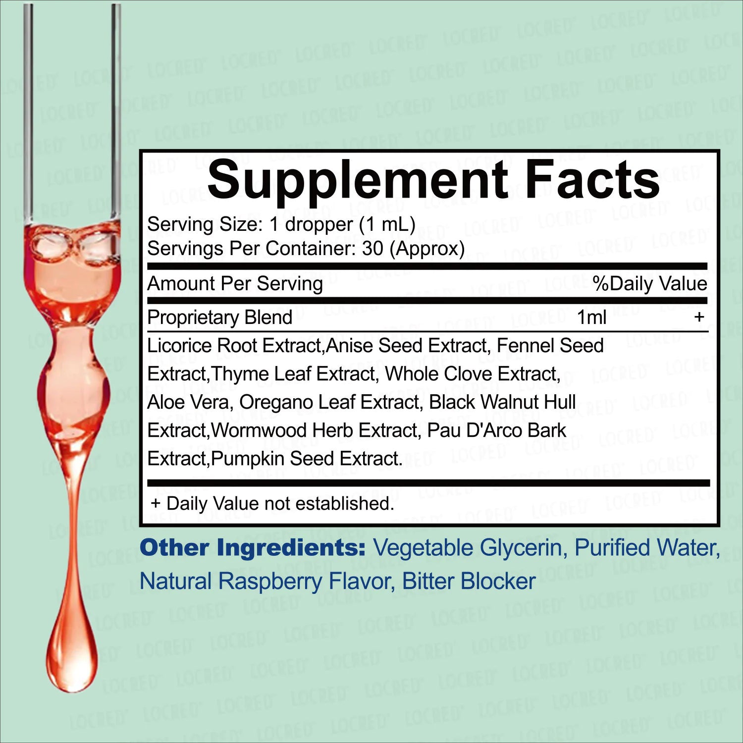 Proprietary Blend 1 mL: Licorice Root Extract, Anise Seed Extract, Fennel Seed Extract, Thyme Leaf Extract, Whole Clove Extract, Aloe Vera, Oregano Leaf Extract, Black Walnut Hull Extract, Wormwood Herb Extract, Pau D'arco Bark Extract, Pumpkin Seed Extract.